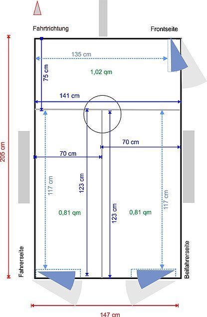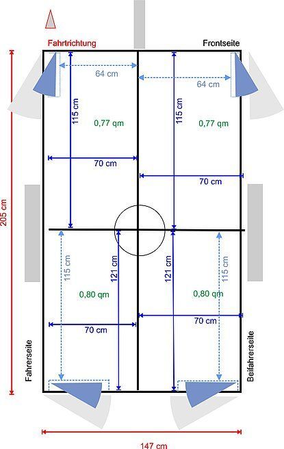 De layout van de aanhanger is zoals de traditionele modellen: bij een 3 vaks: 2 deuren achteraan en 1 aan de zijkant, bij een 4 vaks 2 deuren achter en links en rechts aan de zijkant. De aanhanger staat op een 20 cm bredere as dan de andere modellen.